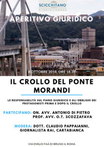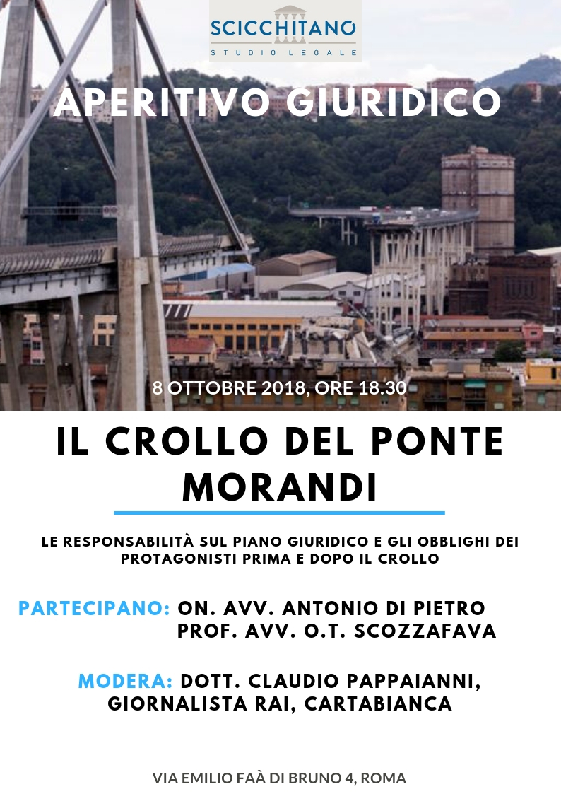 Per il primo appuntamento, ho pensato a un tema che ha toccato il cuore di tutti gli italiani e che, indubbiamente, porta con sé una quantità enorme e complessa di risvolti giuridici: il dramma di Genova. Il tema dell’Aperitivo Giuridico dell’8 ottobre sarà infatti: “IL CROLLO DEL PONTE MORANDI DI GENOVA: LE RESPONSABILITÀ SUL PIANO GIURIDICO E GLI OBBLIGHI DEI PROTAGONISTI PRIMA E DOPO L’EVENTO”.