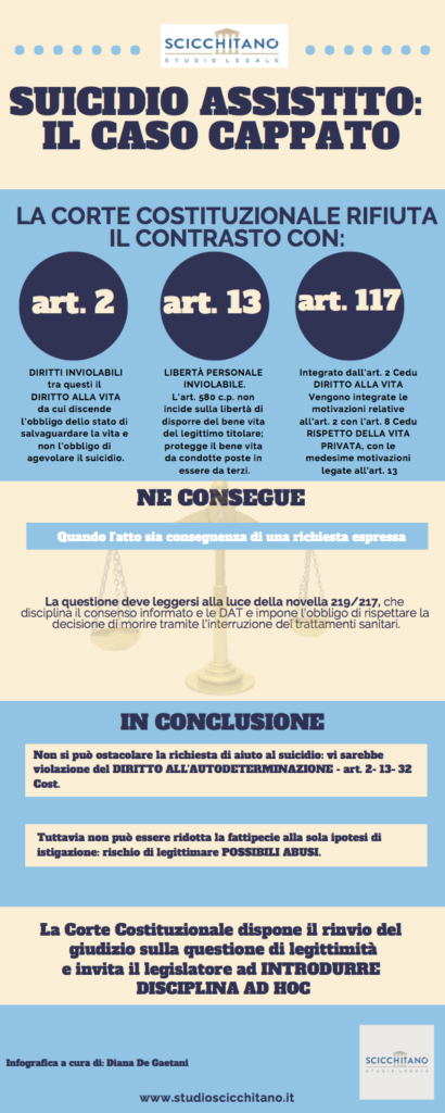 La corte d’Assise di Milano emetteva, quindi, ordinanza per sollevare questione di legittimità costituzionale in riferimento alla sola condotta di “aiuto” al suicidio – integrante la partecipazione “materiale” al suicidio altrui – contenuta nell’art. 580.